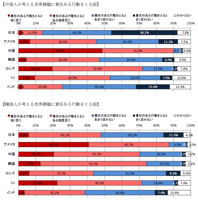 これに対して、中国人は、世界の課題に対して責任ある行動をとる国として、自国の90.1%を除けば、ロシアに七割を越える人が期待を持っているのに対して、米国に対する期待は45.1%に過ぎず、半数に届いていない。韓国人は米国(87.4%)、EU(71.7%)と並ぶように中国(70.6%)にも高い期待がある。