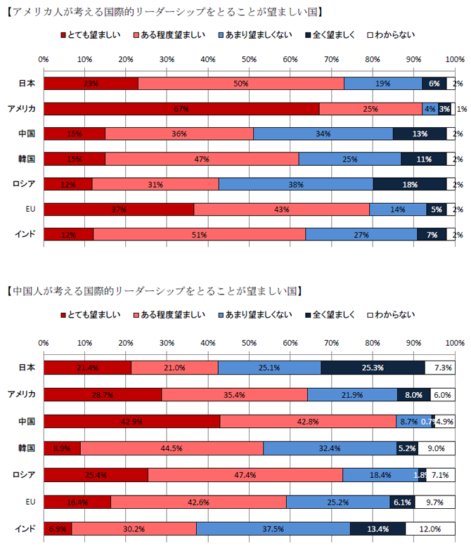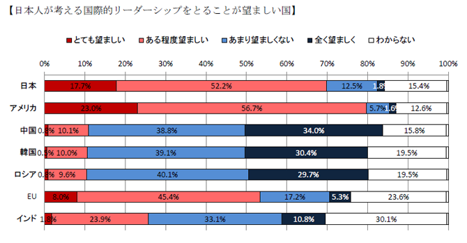 さらに私たちは、日本と中国、米国の3国民に、日本、米国、中国、韓国、ロシア、EU、インドの中で、国際的にリーダーシップをとることが望ましい、と思う国を聞いている。