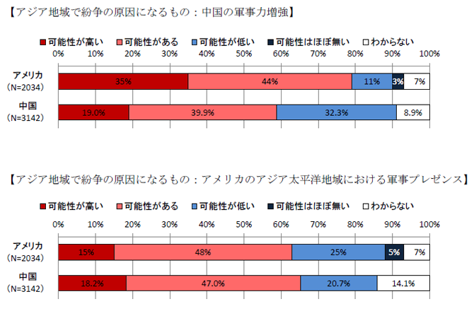 第一は、「中国の軍事的な増強」や、「米国のアジア太平洋における展開」が、今後のアジアの紛争の原因となる可能性がある、という認識が米国と中国の国民に強いことである。