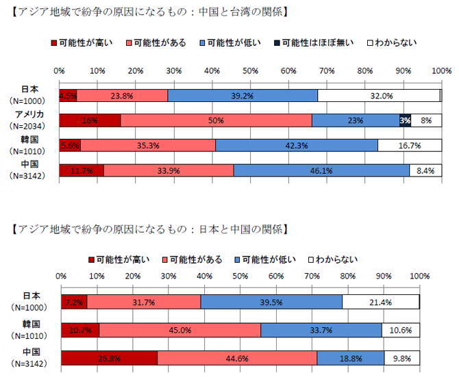 また、台湾の衝突でも、米国民は68%、中国人は81.6%が反対しており、日本と韓国でも賛成は3割程度で、意見が割れている。