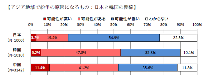 ただ、現実に北東アジアで存在する、二国間の対立に関しては、関係当事国間の国民の意識に非対称性が存在する。例えば、「中国と台湾の関係」に関しては米国の66%が紛争の可能性をある、または紛争の可能性が高い、と考えているが、中国人でその可能性を意識しているのは45.6%に留まった。また、「日本と中国間の紛争」も、中国人の71.4%が、その可能性がある、あるいは、高いと考えているが、日本人でその可能性を指摘しているのは38.9%に過ぎず、39.5%は逆にその可能性はない、と意見が分かれている。「日本と韓国間の紛争」も、韓国人の54%が紛争の可能性を意識しているが、日本人でその可能性を意識しているのは、22.6%に過ぎない。