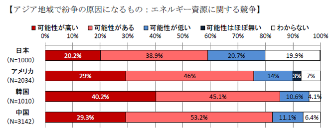 全ての設問で共通して言えるのは、日本人の地域紛争に関する認識が相対的に希薄だということである。しかし、それを差し引いても、この4か国の国民間には紛争の原因の可能性をめぐり、注目できるいくつかの傾向が存在する。