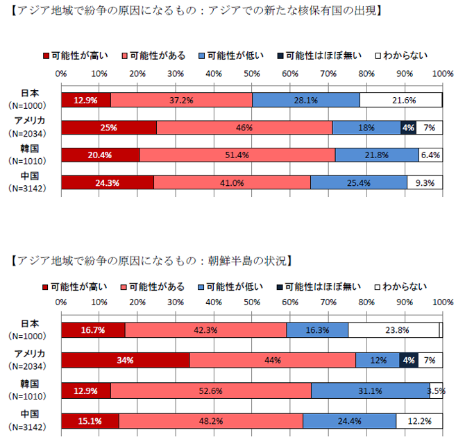 第三は、4か国の過半数の国民が共通して、紛争の可能性があると認識している課題も北東アジアに存在している、ことである。「エネルギー資源の競争」(日本人59.1%、米国人75%、韓国人85.3%、中国人82.5%)、「アジアでの新たな核保有国の出現」(日本人50.1%、米国71%、韓国71.8%、中国65.3%)、「朝鮮半島の状況」(日本人59%、米国78%、韓国65.5%、中国63.3%)である。新たな核保有国の出現と、朝鮮半島の状況を危惧する傾向は特に米国民と韓国民に強い。