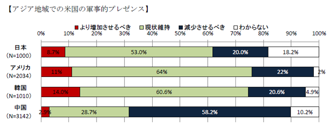 米軍の存在に関しては日米韓の国民に、現状維持を求める声が多いが、紛争への米軍の介入に関しては、米国民の中にかなり消極的な見方が強く、特に朝鮮半島の平和統一後の米軍駐留に関して、それを必要とするかで米中、日韓の国民間に意識の差がある、ことも浮き彫りになっている。