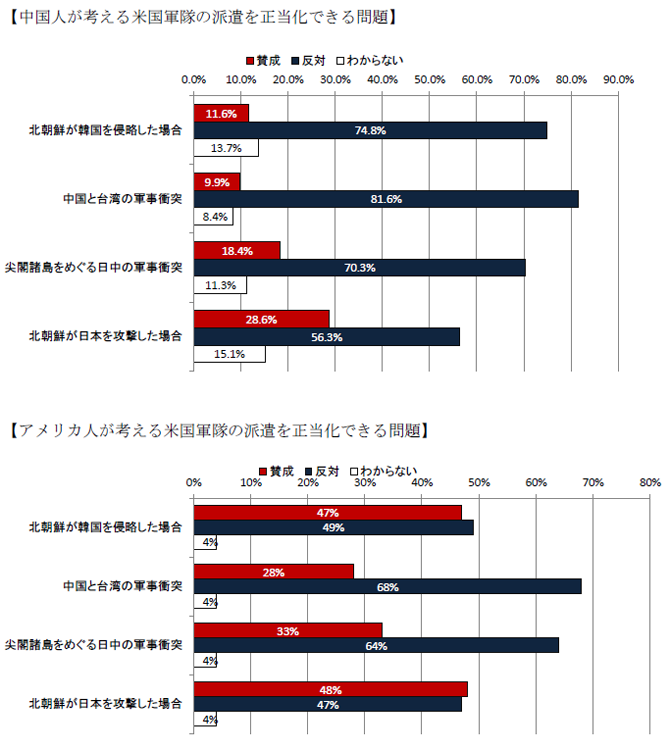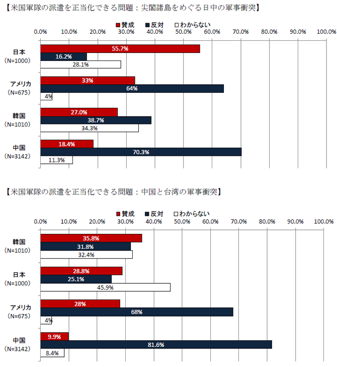 これに対して米国民や中国民の反対が目立つのは、尖閣諸島での日中衝突と、台湾での衝突である。尖閣諸島での米軍の派遣に賛成が多いのは、日本人の55.7%(反対は16.2%)のみで、米国民は64%(賛成は33%)、中国人は70.3%(賛成は18.4%)が反対している。韓国も反対が38.7%で、賛成の27%よりも多い。