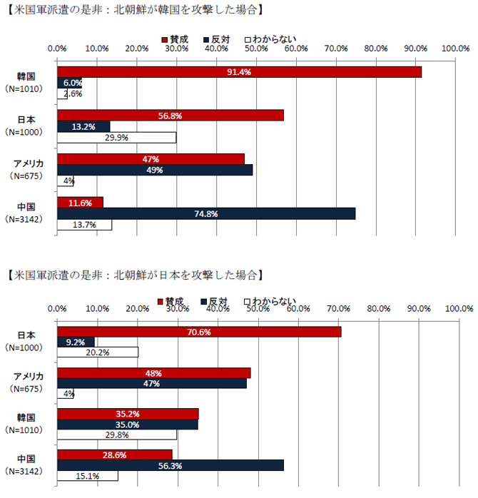 例えば、朝鮮有事で北朝鮮が韓国を攻撃した場合は、韓国民の91.4%が米軍の派遣を賛成しており、日本人も56.8%(反対は13.2%)が賛成しているが、米国民は賛成が47%、反対が49%と賛否で意見が割れている。これに対して中国人は74.8%が米軍の派遣に反対している(賛成は11.6%)。