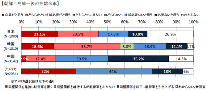これに関連して、朝鮮半島の平和統一後のおける在韓米軍の駐留に関しても、4か国間の国民間で意見が分かれている。統一後も駐留軍が必要と考える国民が多いのは、韓国と日本で、韓国人は57.3%が「必要」と考え(必要ないは31%)で、日本人は44.6%が「必要」だと考えている(同28.4%)。これに対して、中国では65.7%が「必要ではない」と考え(必要は19.9%)で、米国では「同盟関係を維持し駐留軍を置く」は32%だが、「同盟関係は維持するが、駐留軍は置かないが」が44%、さらに「同盟関係を終了し、駐留軍は引き上げる」が18%と、合わせて62%が駐留軍の引き上げを、求めている。