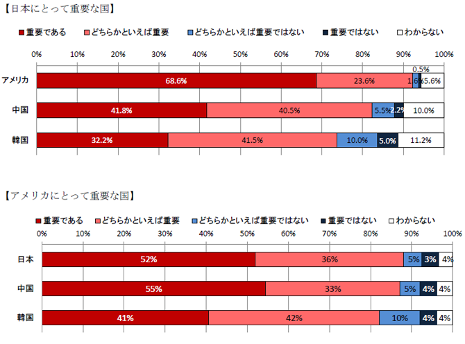日本人にとっては、米国との2国間関係が最も重要である。「重要」と、「どちらかといえば重要」と回答する国民は合わせて92.2%と最も多く、中国が82.3%で続いている、韓国は73.7%である。