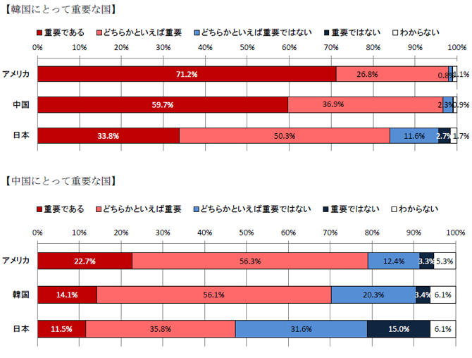 韓国も米国との関係を「重要」だと考える国民が98%で最も多いが、中国との関係が「重要」と考える人も96.6%とほぼ並んでいる。日本との関係が「重要」だと考える人は84.1%と少し差が開いている。