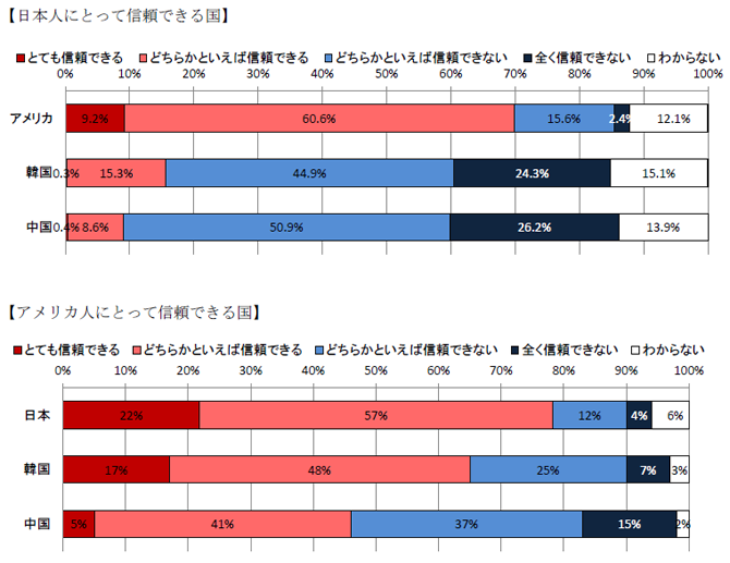 さらに、調査では日本と中国と米国の3国民に、日本と中国、韓国、米国の4か国の中で信頼できる国はどこかを聞いている。