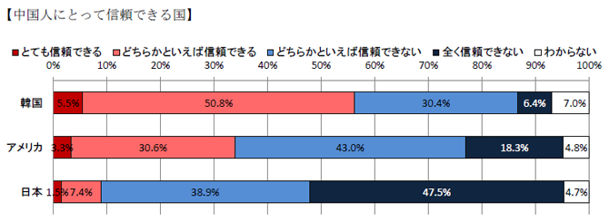 これに対して中国人が、信頼できると思う国は、この4か国では韓国が56.3%と最も多く、米国は33.9%と韓国よりも少ない。逆に信頼できない(全く、とどちらかと言えば、の合算)は61.3%で半数を越えた。