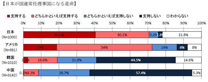 最後に、日本が国連の安全保障理事会の常任理事国に入る、ことの賛否を4か国の国民に聞いた。支持しているのは、日本の米国の二つの国民で、日本は70.6%、米国人は73%が支持している。これに対して、中国と韓国の国民は厳しい態度を崩しておらず、韓国人の66.3%、中国人の86.1%が支持していない。