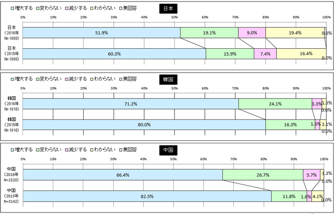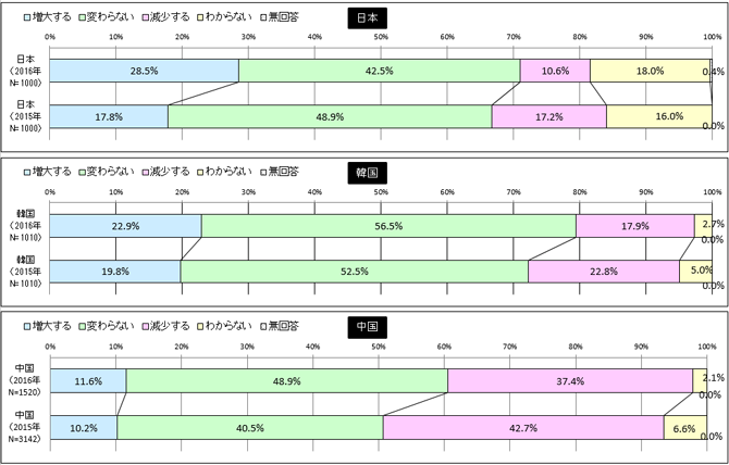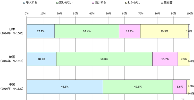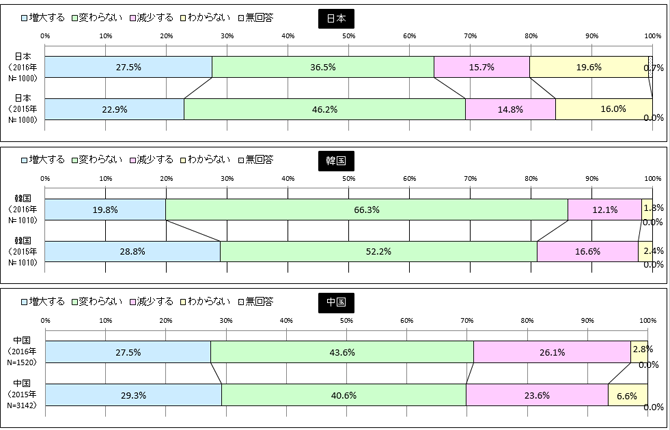 今年の調査でも、中国の影響力はアジアでさらに増大するとみる人は、日本でも51.9%と半数を超え、特に韓国民は71.2%と突出している。これに対してアメリカの影響力の拡大を現在と「変わらない」とみる人は、韓国で66.3%,日本で36.5%、中国で43.6%と3カ国のそれぞれの回答で最も多い。
