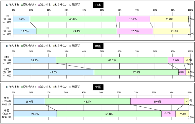 しかし、この一年間で国民間の意識に幾つかの重要な変化がみられる。第一は中国の影響力のアジアでの拡大を予想する人は3カ国でいずれも昨年よりも減少したことである。自国の影響力の拡大に自信を深めていた中国国民の間でその傾向は特に大きく、今回の調査では自国の影響力が増大するとみる中国人は66.4%と昨年の82.5%から大きく減少した。逆に影響力が「減少する」とみる人はわずかではあるが、昨年の1.6%から、今年は5.7%に増えている。