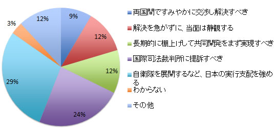 ○領土問題は存在しないとの立場をとるべきではない。ICJに提訴することでそれぞれの国内世論を鎮静化させ、そのうえで共同開発など長期的な解決を探るべきである。(50代)、NPO・NGO関係者)