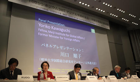 「アジア太平洋の未来--平和と発展の新展開」と題したフォーラムでは、日本から、元外務大臣の川口順子氏、前駐米大使の藤崎一郎氏、オーストラリアから元首相のケビン・ラッド氏、中国から北京大学国際戦略研究院長の王緝思氏、韓国からソウル国立大学国際関係学部准教授のジョン・ジェソン氏が参加しました。北朝鮮の核ミサイル問題から南シナ・東シナ問題まで世界的に最も不安定な地域の一つであるアジア太平洋において、包括的な安全保障の枠組みをこの地域につくることの重要性について一致しました。